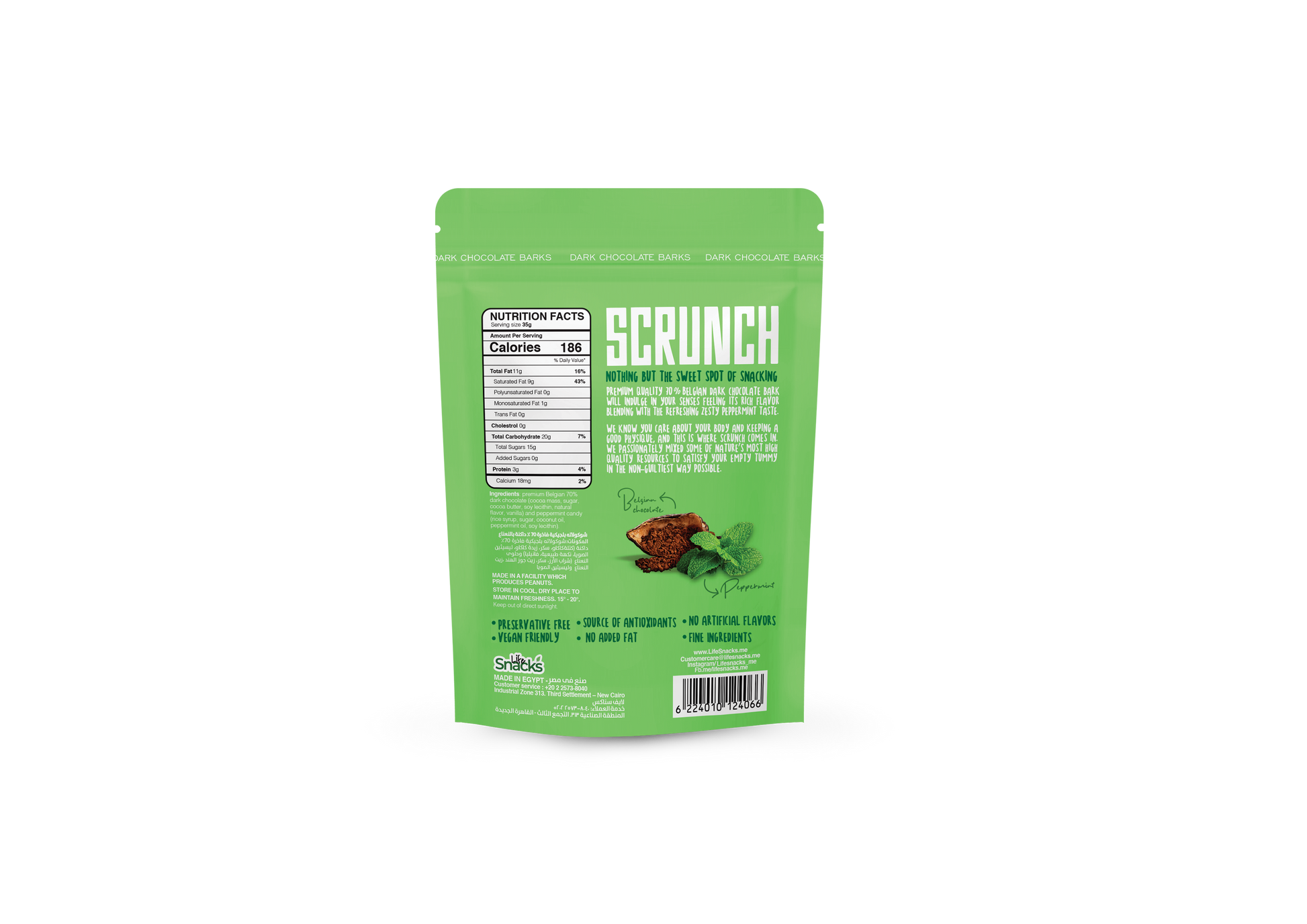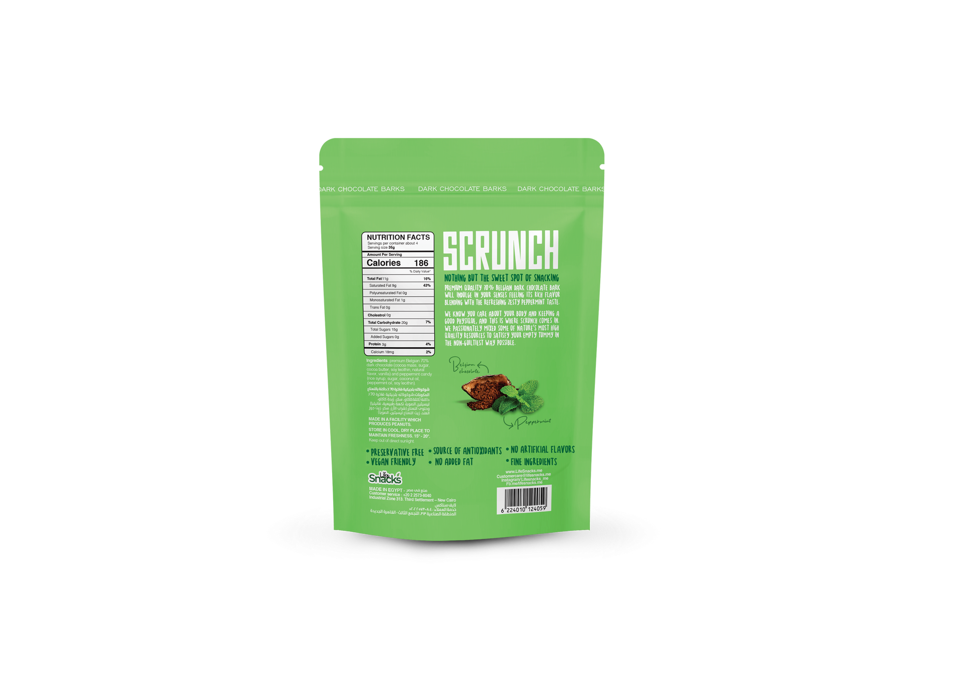 Belgian 70% dark chocolate with fresh peppermint crunchy candy.